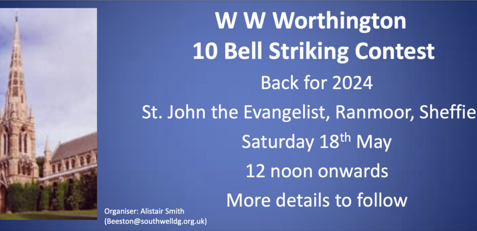 Towers in the Leicester Guild are invited to enter the W W Worthington 10 Bell Contest, to be held this year at St John the Evangelist, Ranmoor, Sheffield, on Saturday 18th May.